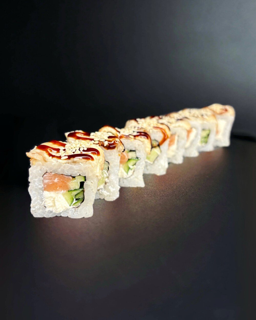 Лосось, Сыр сливочный, Угорь, Унаги соус, Кунжут