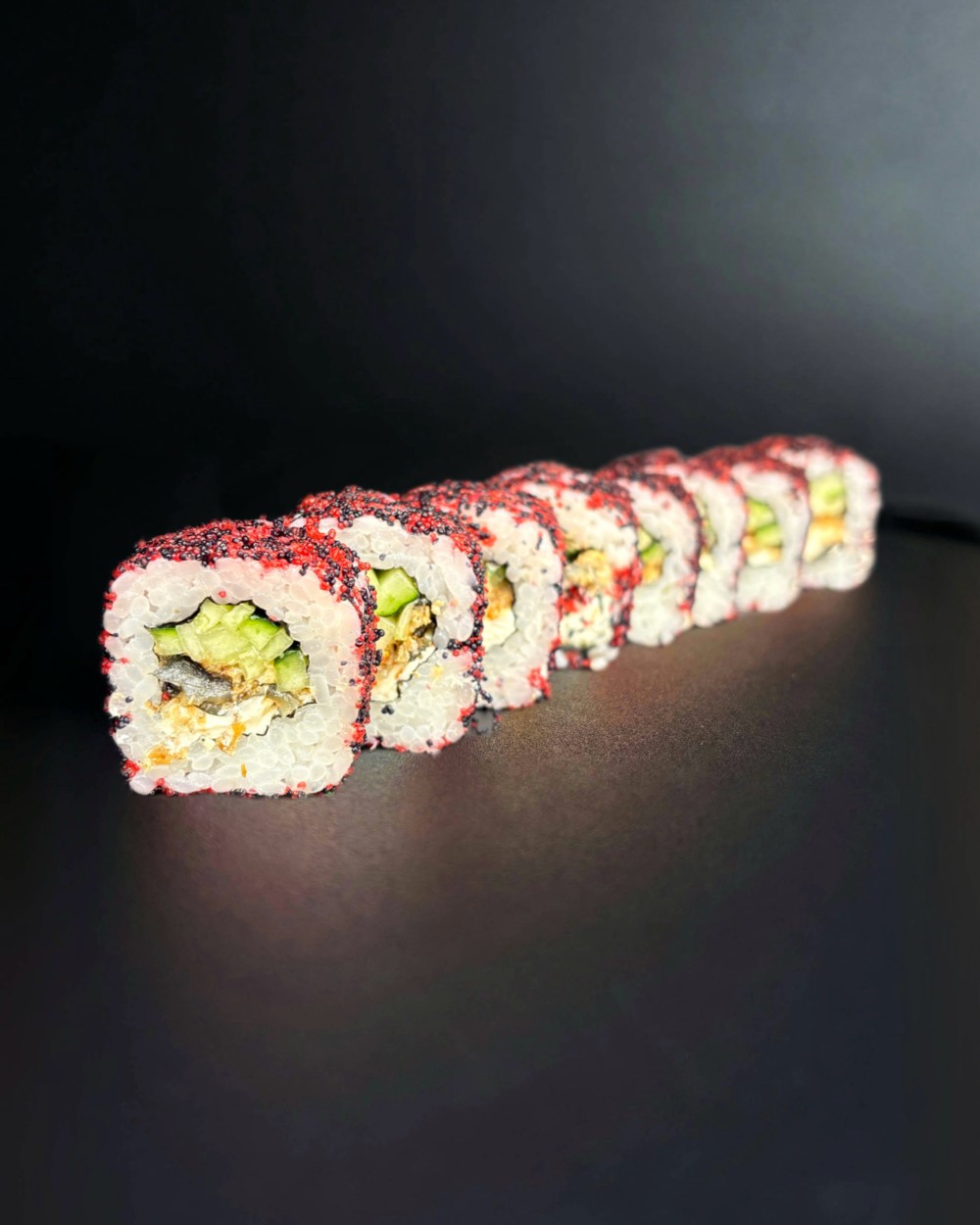 Перемолотый Угорь, Сыр сливочный, Огурец, Тобико красная/черная