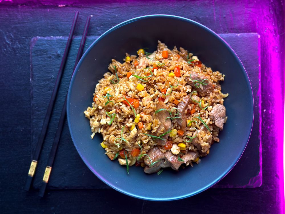 Состав: Рис, Свинина, Морковка, Кукуруза, Перец сладкий, Омлет, Креветочный соус
