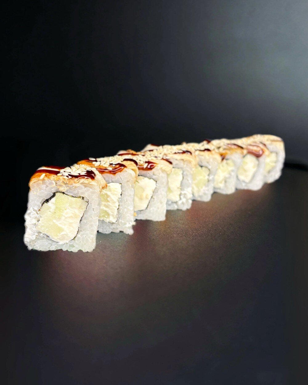 Угорь, слив сыр. яблоко, унаги соус, кунжут