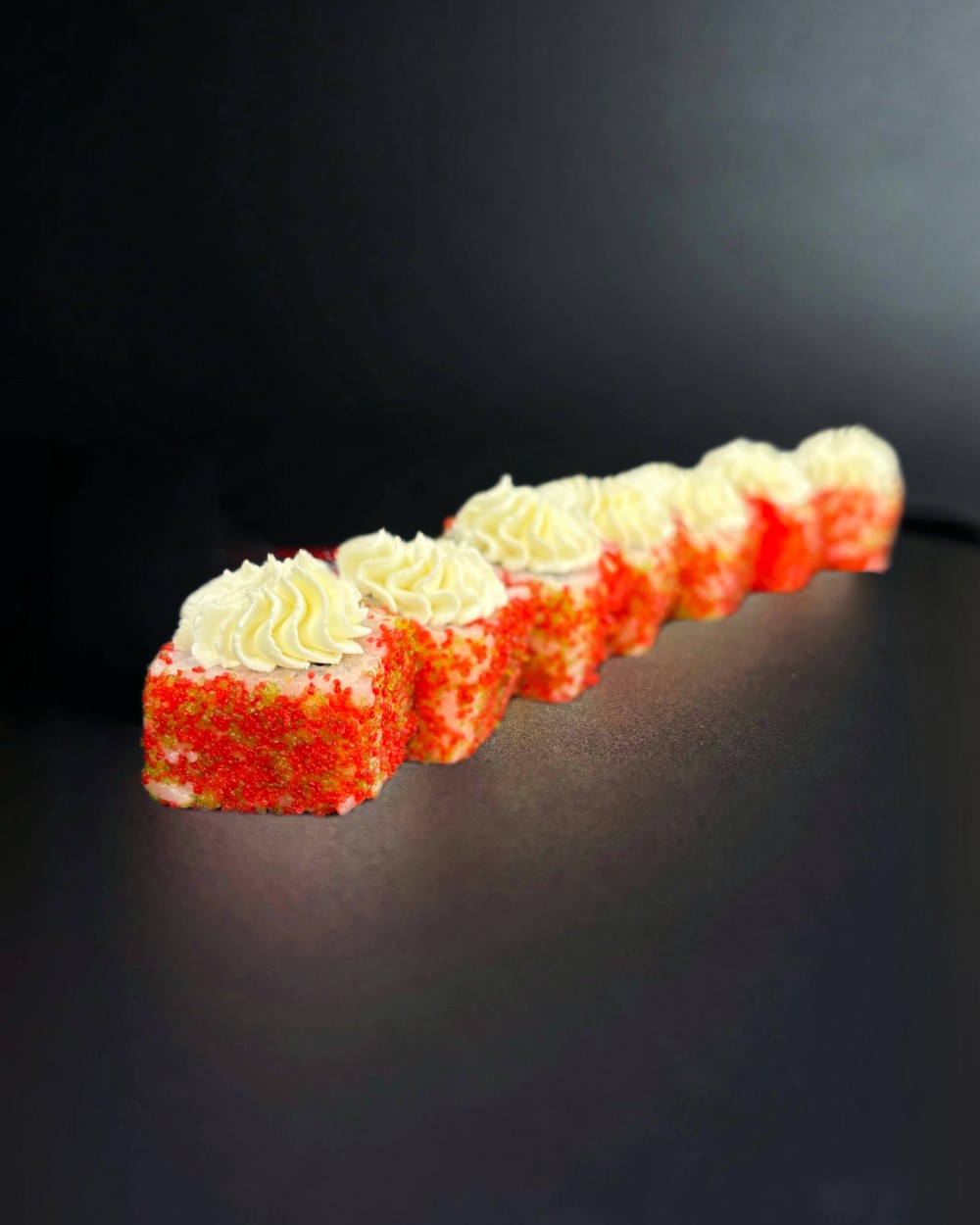 Креветка темпура, Бекон, Сыр сливочный, Тобико красная/зелёная